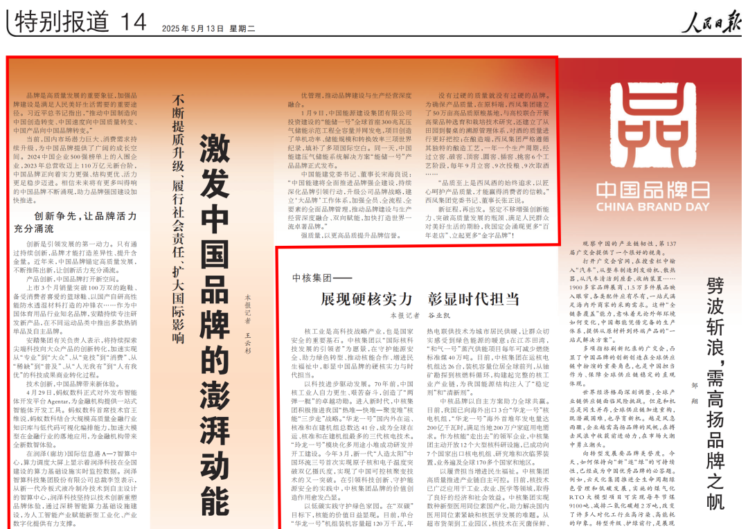 不断提质升级、履行社会责任、扩大国际影响激发中国品牌的澎湃动能(中国品牌日)本报记者 王云杉《人民日报》(2025年05月13日第14版)品牌是高质量发展的重要象征,加强品牌建设是满足人民美好生活需要的重要途径。习近平总书记指出,“推动中国制造向中国创造转变、中国速度向中国质量转变、中国产品向中国品牌转变。”