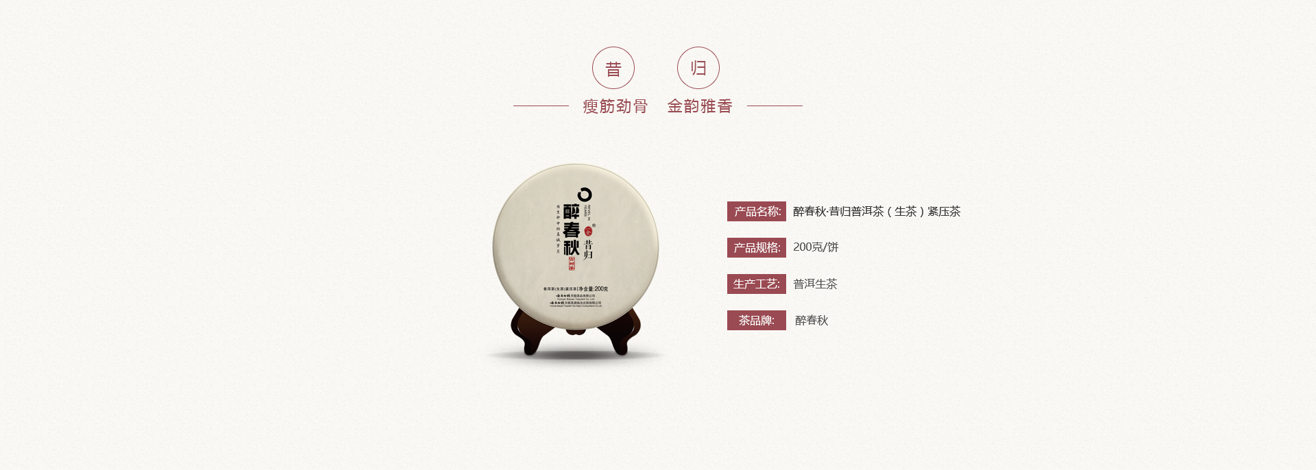 醉春秋·昔归普洱茶(生茶)紧压茶,精选生长环境为“头顶大雪山,脚踩澜沧江”被茶友喻为临沧茶王的昔归古树晒青茶为原料,沿袭经典传统制茶技艺精制而成。